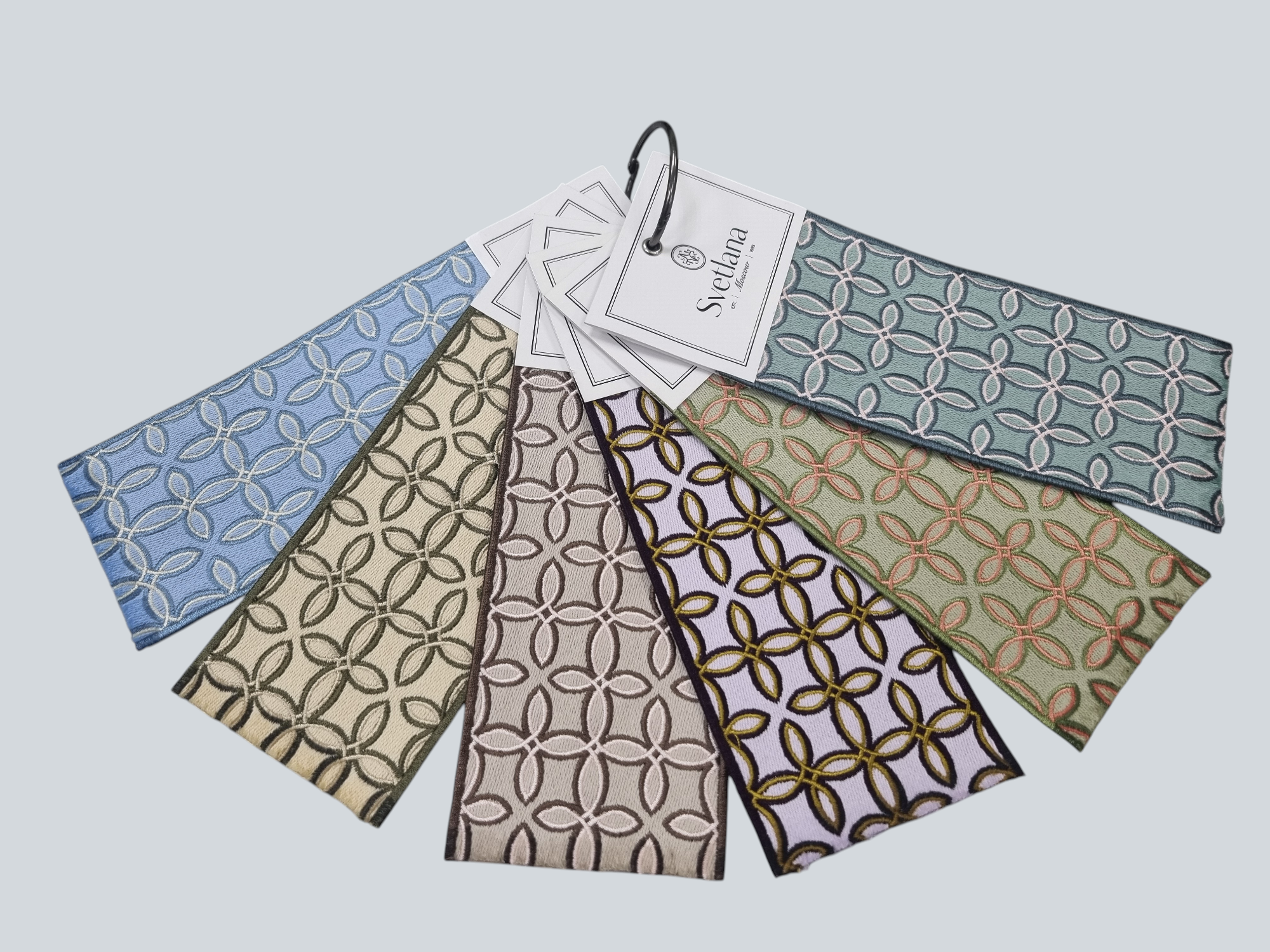 Сет представляет собой полный набор всей цветовой гаммы артикула 4005 тесьмы шириной 77 мм с вышитым орнаментом в виде четырёхлистного цветка в 6 цветах из коллекции Babylon, с этикеткой и обработанным краем. Данная опция предоставляется под заказ. Срок изготовления Сета составляет 30 дней с момента получения полной предоплаты.